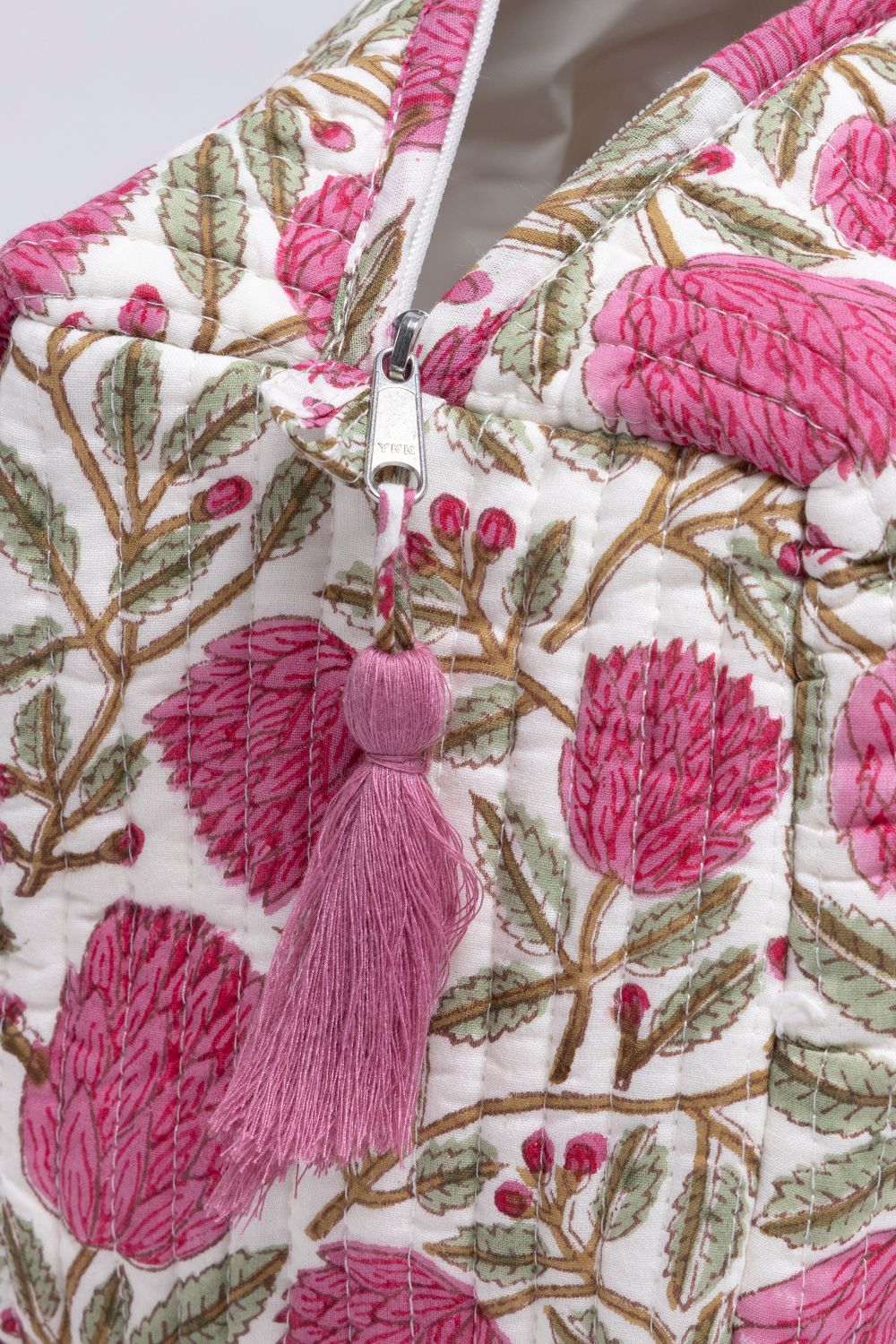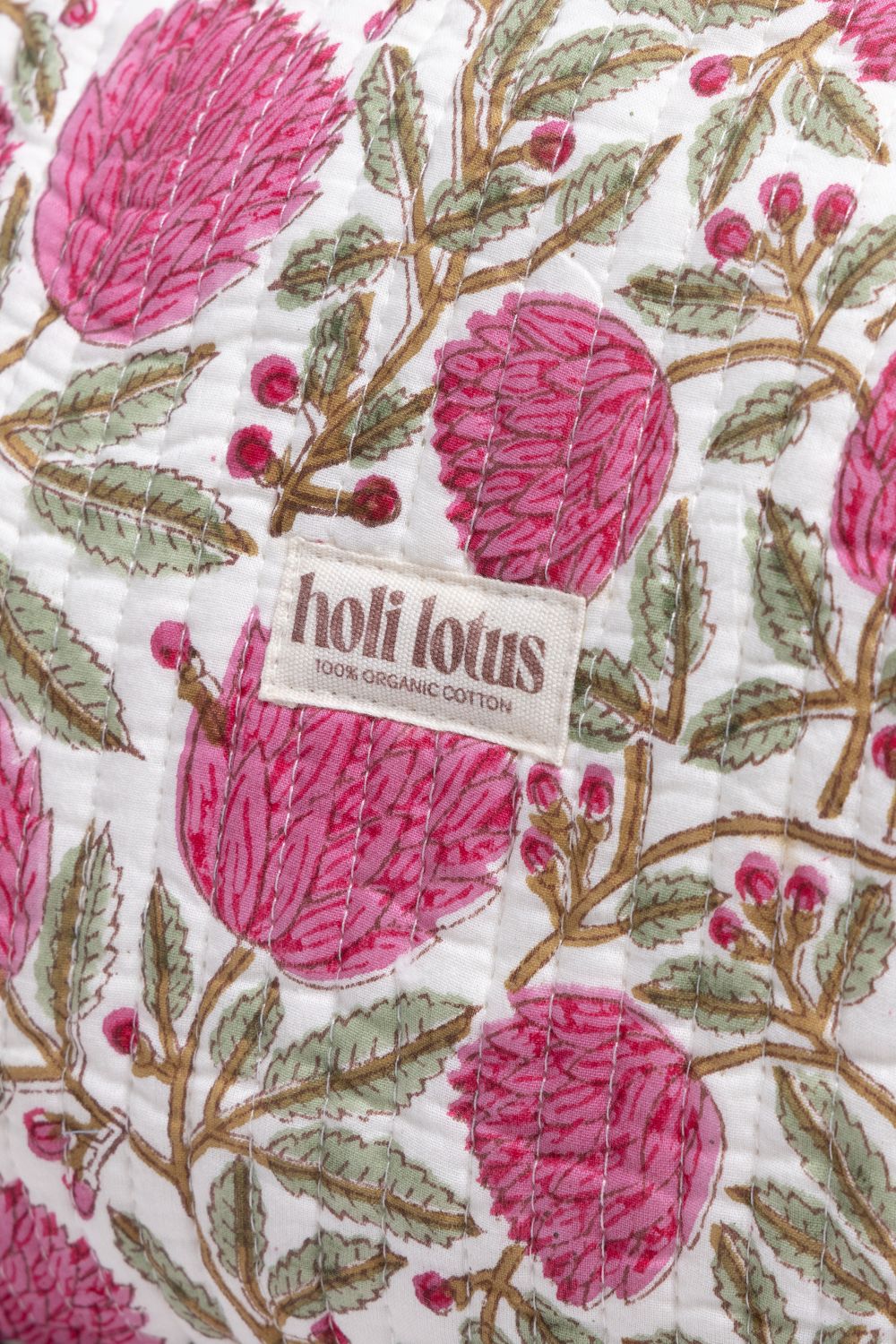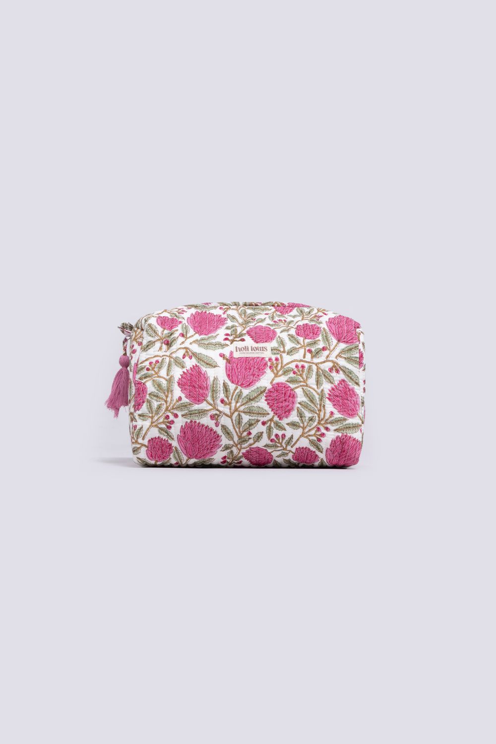 100% organic cotton wash bag with hand block print. A spacious travel bag with waterproof lining. Perfect for keeping your toiletries organised at home or whilst travelling.