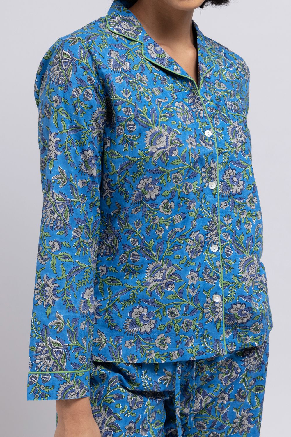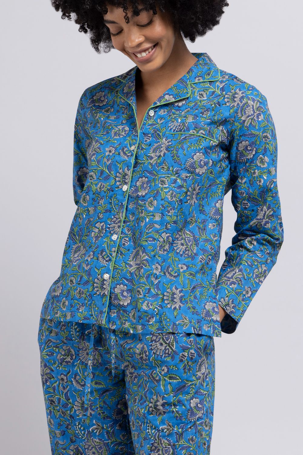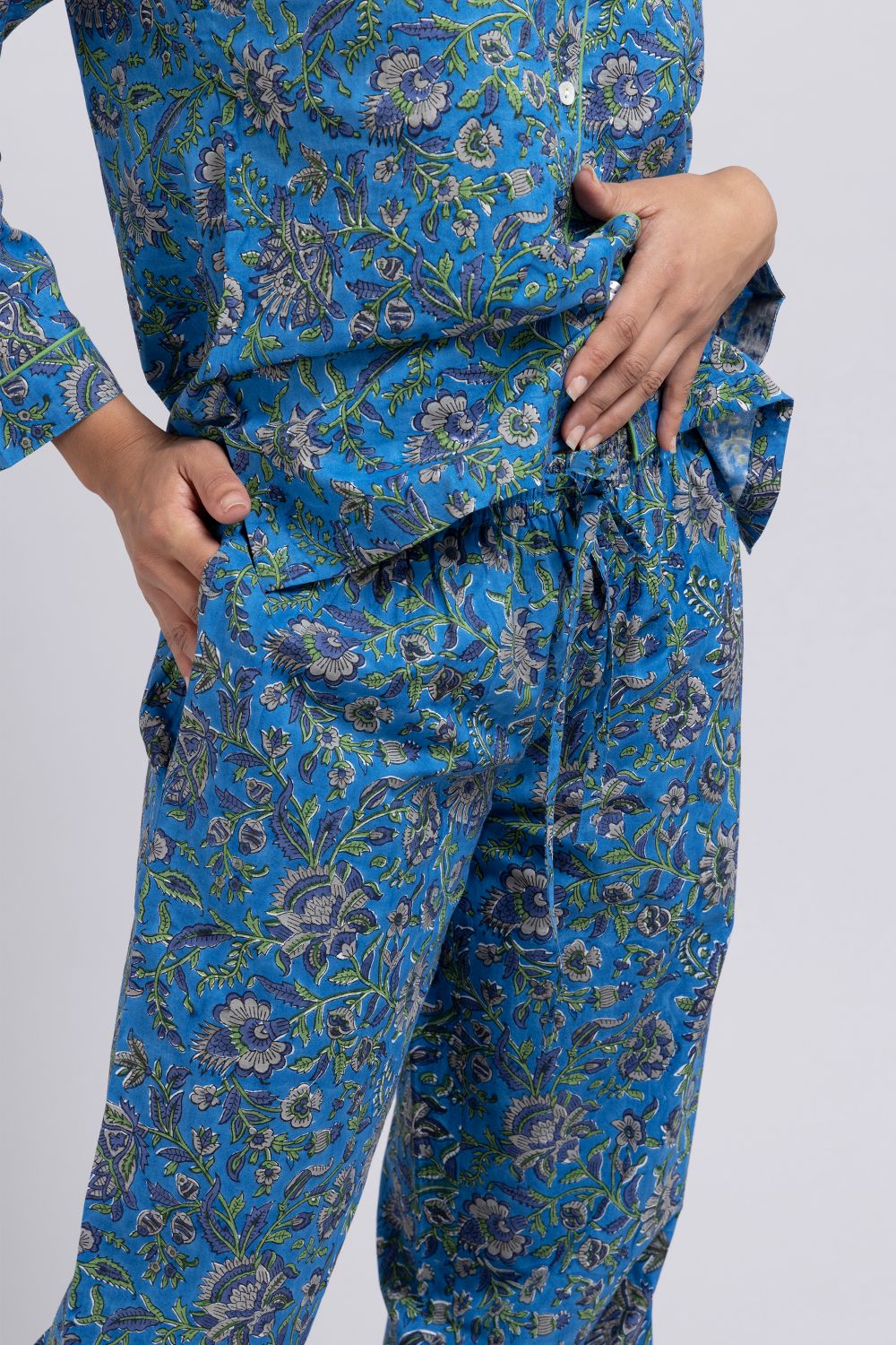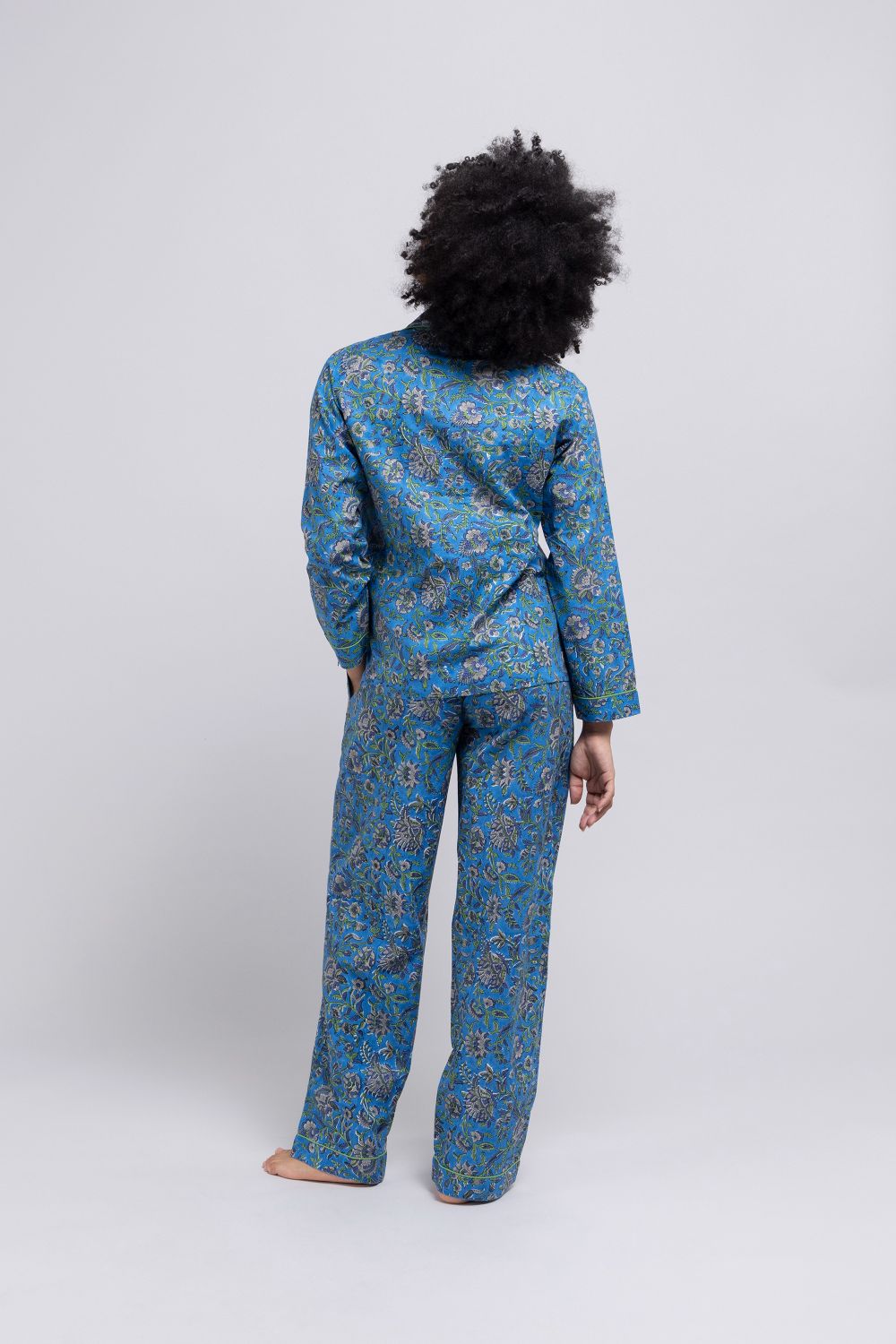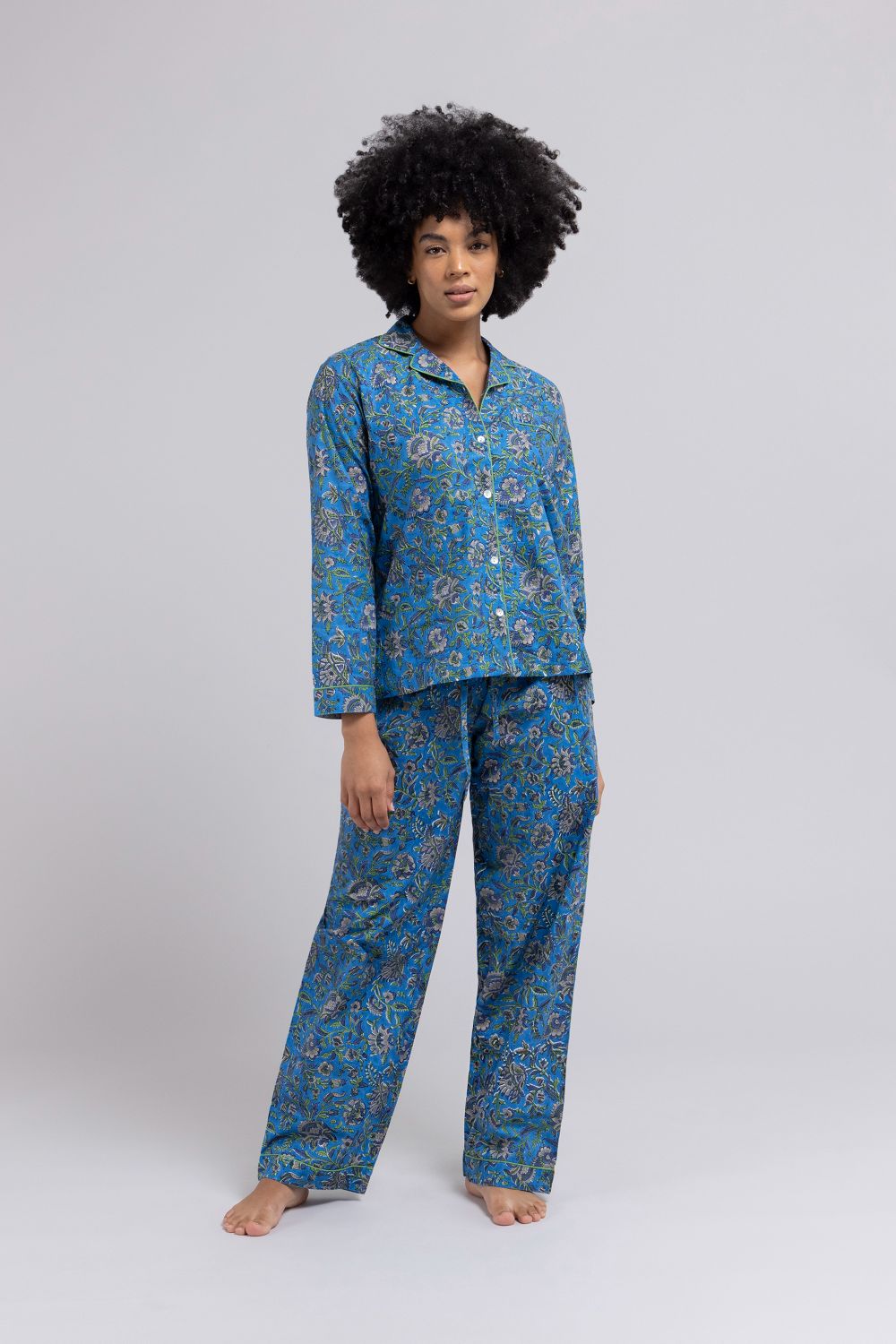 100% organic cotton pyjama set with hand block print. A breathable long sleeve set, perfect for daytime lounging and cosy nights in. A comfortable, relaxed fit.