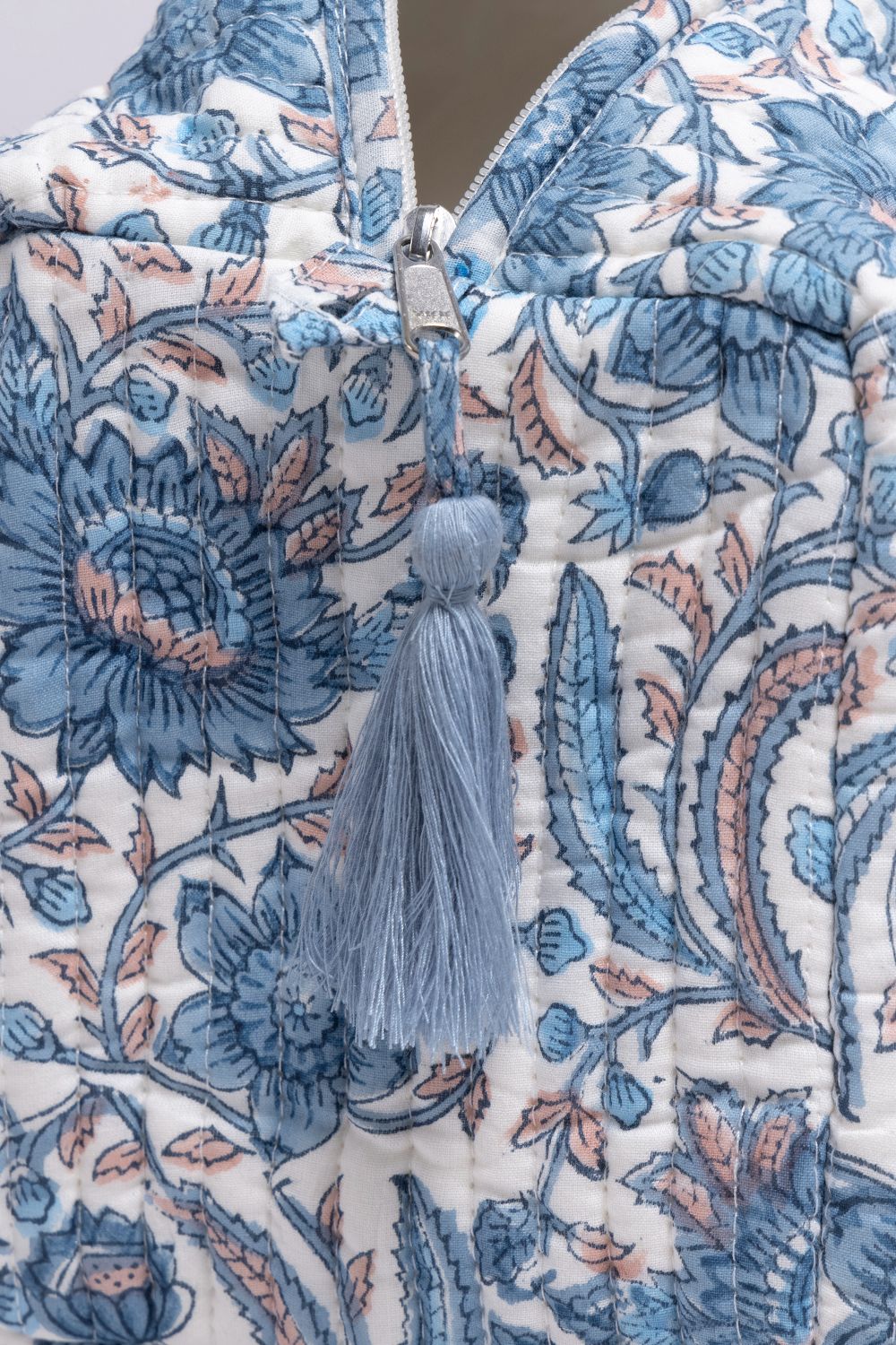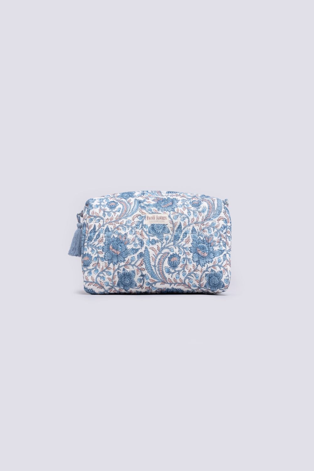 100% organic cotton wash bag with hand block print. A spacious travel bag with waterproof lining. Perfect for keeping your toiletries organised at home or whilst travelling.